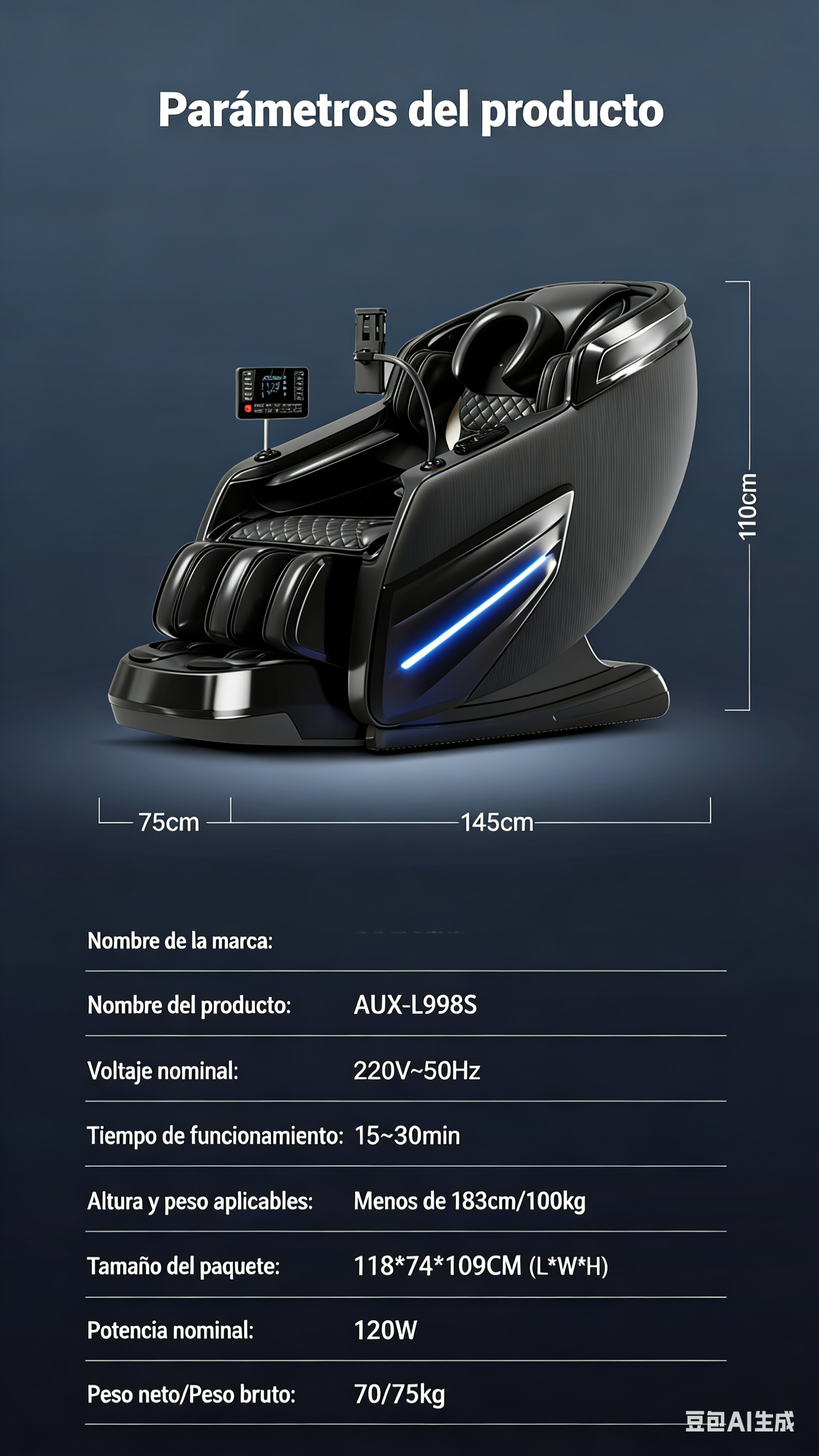 Potencia nominal: 120 W. Tiempo de funcionamiento nominal: 20 min. Rango de inclinación: 95-175 grados