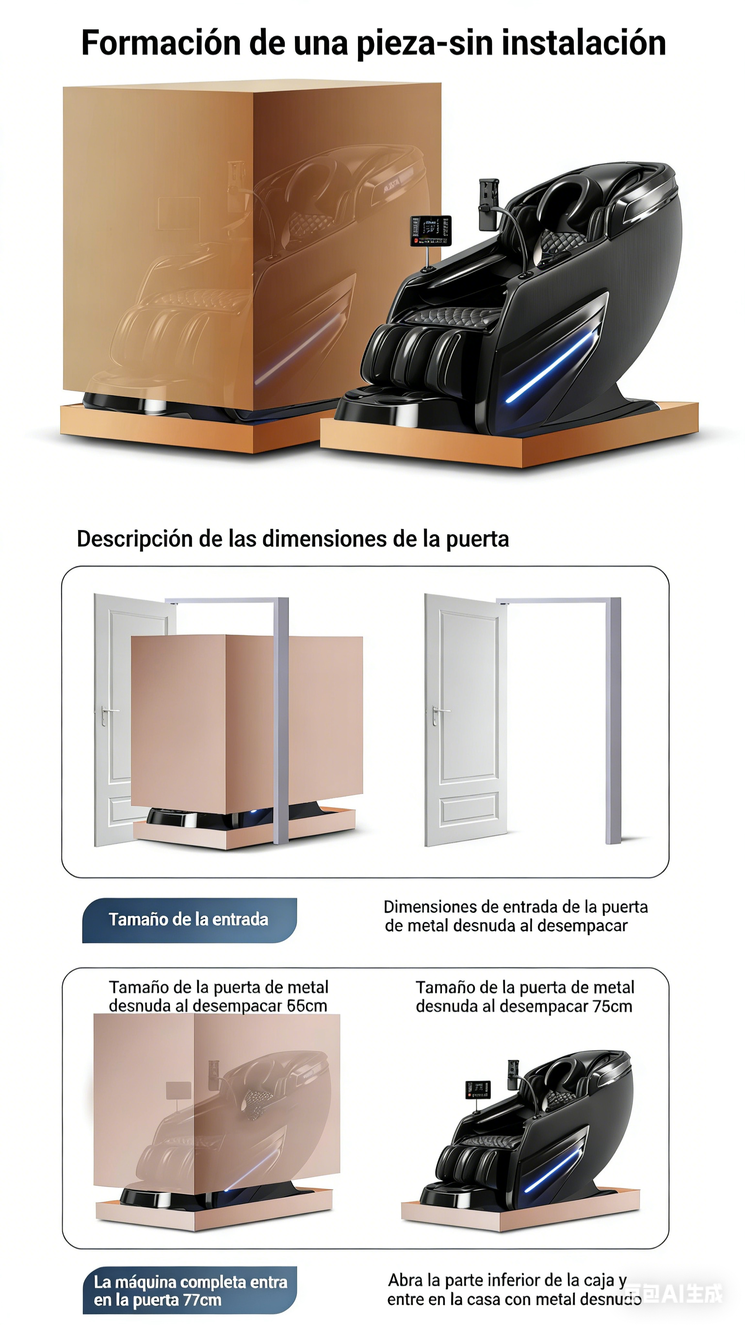 Dimensiones de la caja: 116 x 75 x 109 cm. Unidades/caja: 1 unidad. Peso neto-peso bruto/ancho: 87 kg-97 kg. 1 unidad de 20 GP: 30 unidades; 1 unidad de 40 GP: 66 unidades; 1 unidad de 40 HQ: 66 unidades.